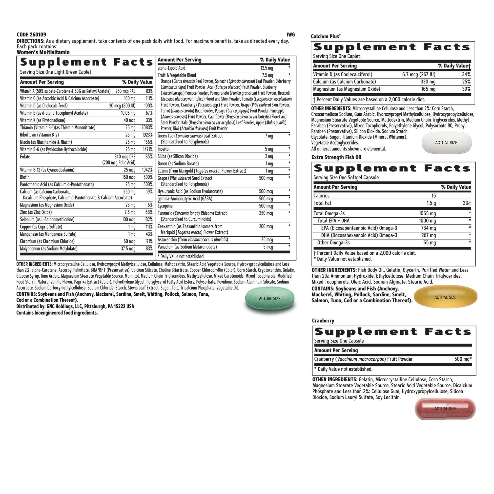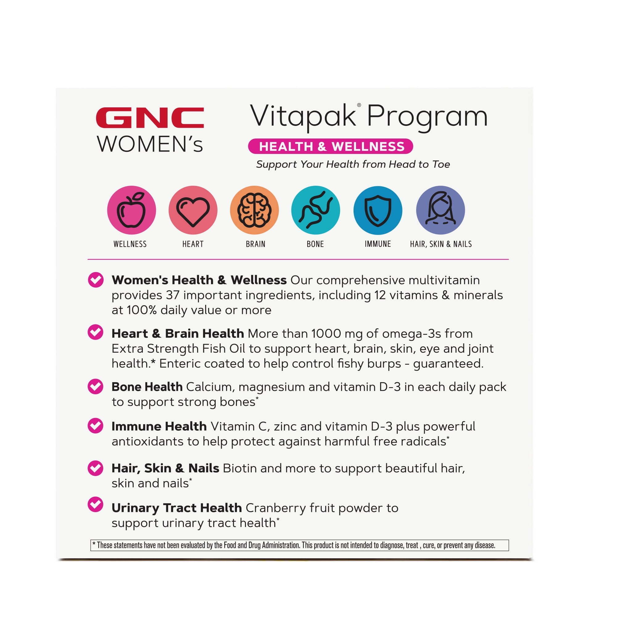 GNC Women's Health & Wellness Vitapak is a customized 4-in-1 nutrition program for comprehensive daily women's health support that combines the benefits of a GNC Women’s multivitamin and Extra Strength Omega-3 Fish Oils plus formulas to support immune, bone, heart, brain, & urinary tract health, as well as beautiful hair, skin, & nails —all in convenient daily packs that take the guesswork out of your nutrition regimen*. Each daily vitamin pack is specially curated to supports the unique Health & Wellness needs of women and delivers over 40 important nutrients, vitamins, mineral, herbs, fruits, veggies, and Omega-3 Fish Oils for unmatched nutritional support and incredible value*.