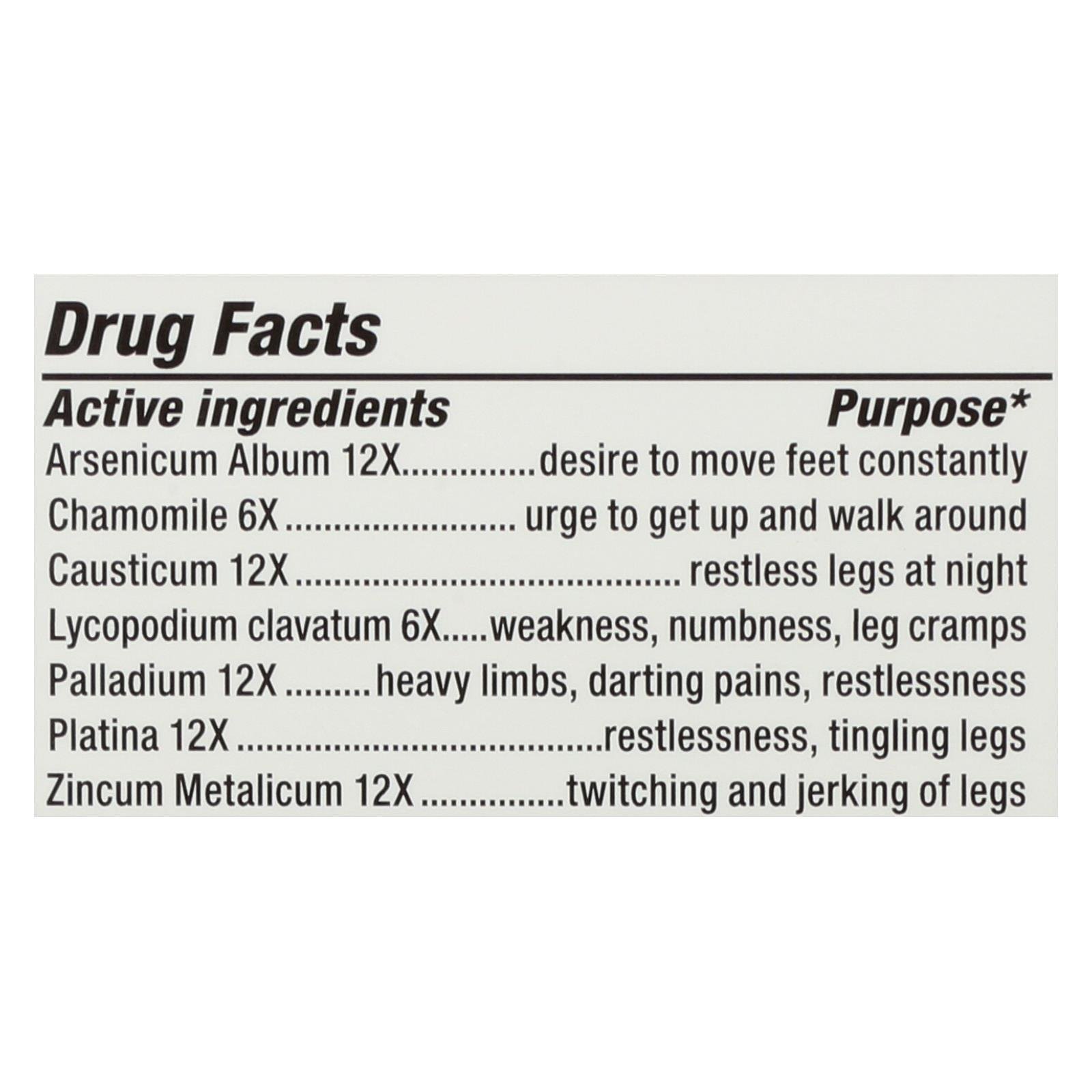 ingredients : arsenicum album 12x purpose* desire to move feet constantly chamomile 6x purpose* urge to get up and walk around causticum 12x purpose* restless legs at night lycopodium clavatum 6x purpose* weakness;numbness;leg cramps palladium 12x purpose* heavy limbs;darting pains;restlessness platina 12x purpose* restlessness;tingling legs zincum metalicum 12x purpose* twitching and jerking of legs;cellulose;croscarmellose sodium;dextrose;lactose;magnesium stearate